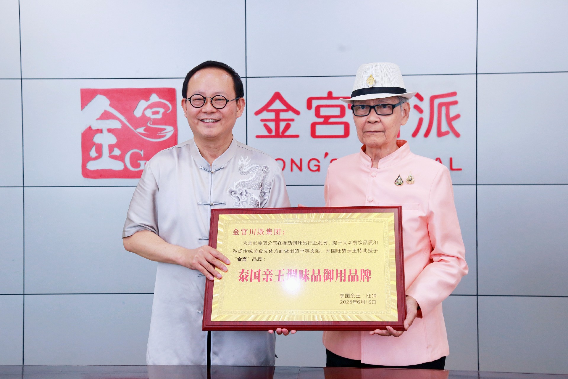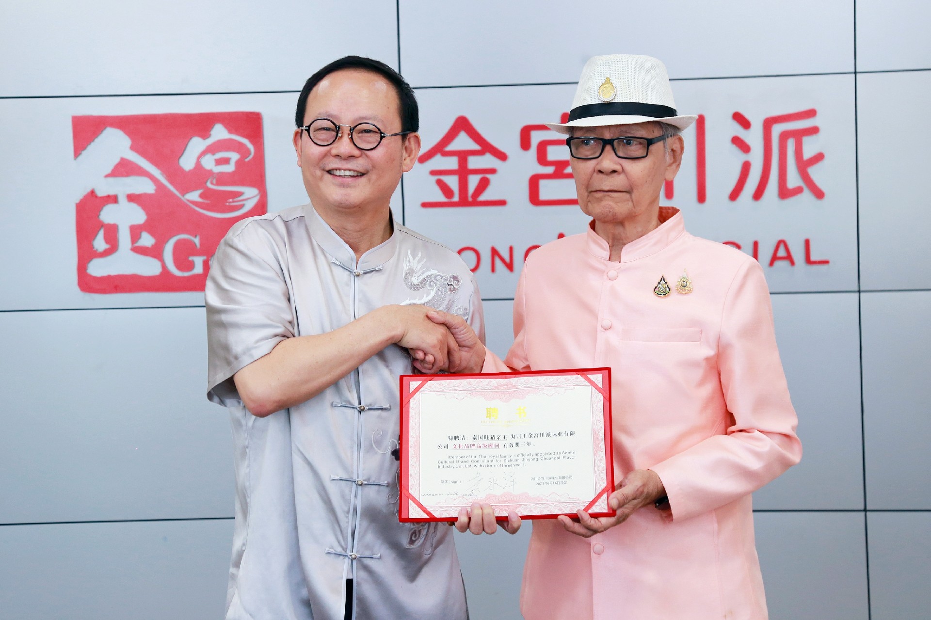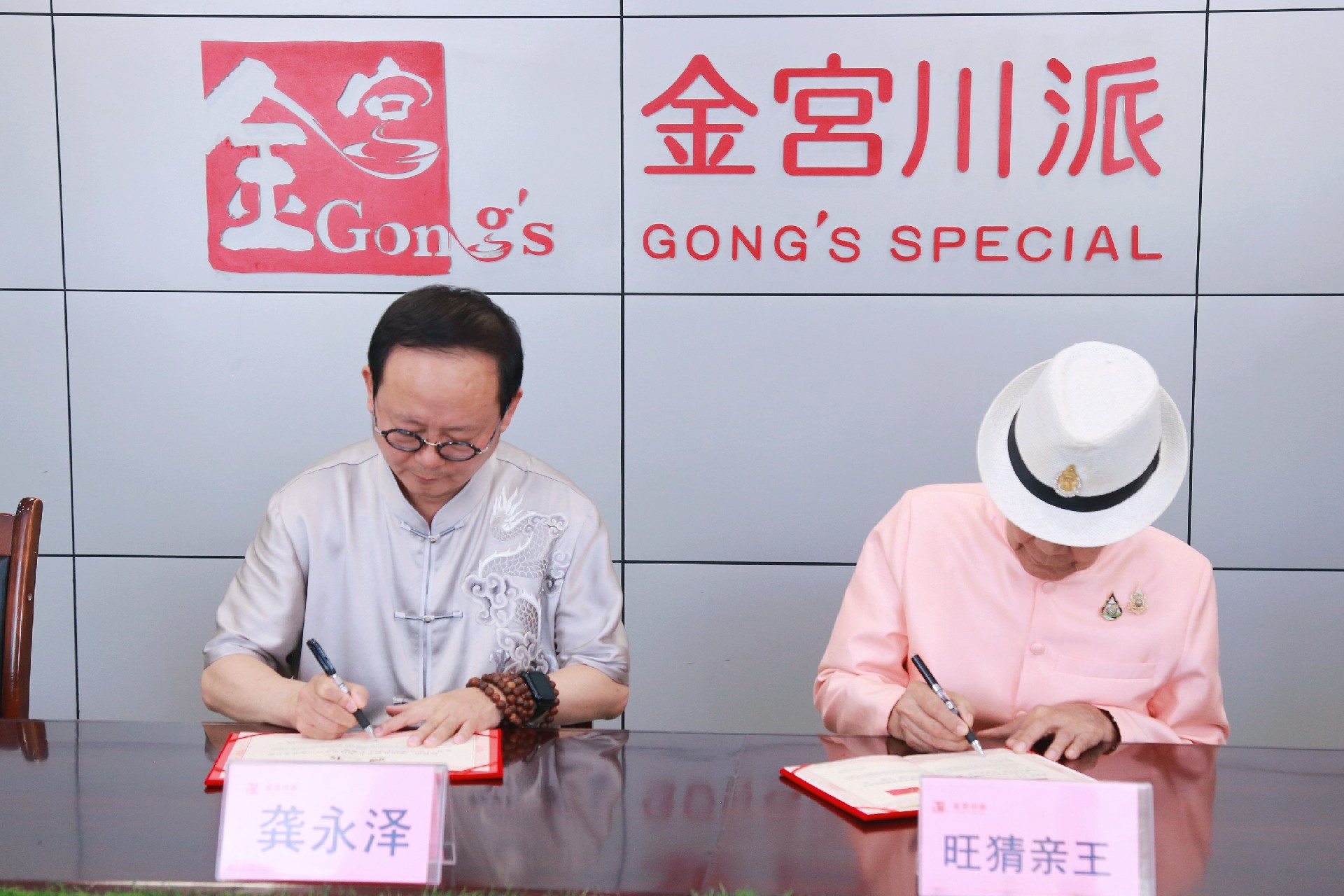同时,会上签署了聘书和荣誉证书。龚永泽董事长被特聘为泰国旺猜亲王的川派美食顾问,并被特授予中泰美食文化大使称号。金宫品牌被授予"泰国亲王调味品御用品牌",川派、百信品牌被授予"泰国亲王指定调味品合作品牌",金宫川派集团旗下多个品牌同时被授予泰国亲王指定合作品牌;金宫川派集团特聘请泰国旺猜亲王为公司文化品牌高级顾问。