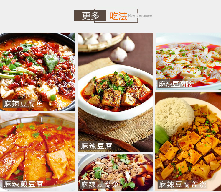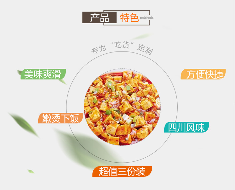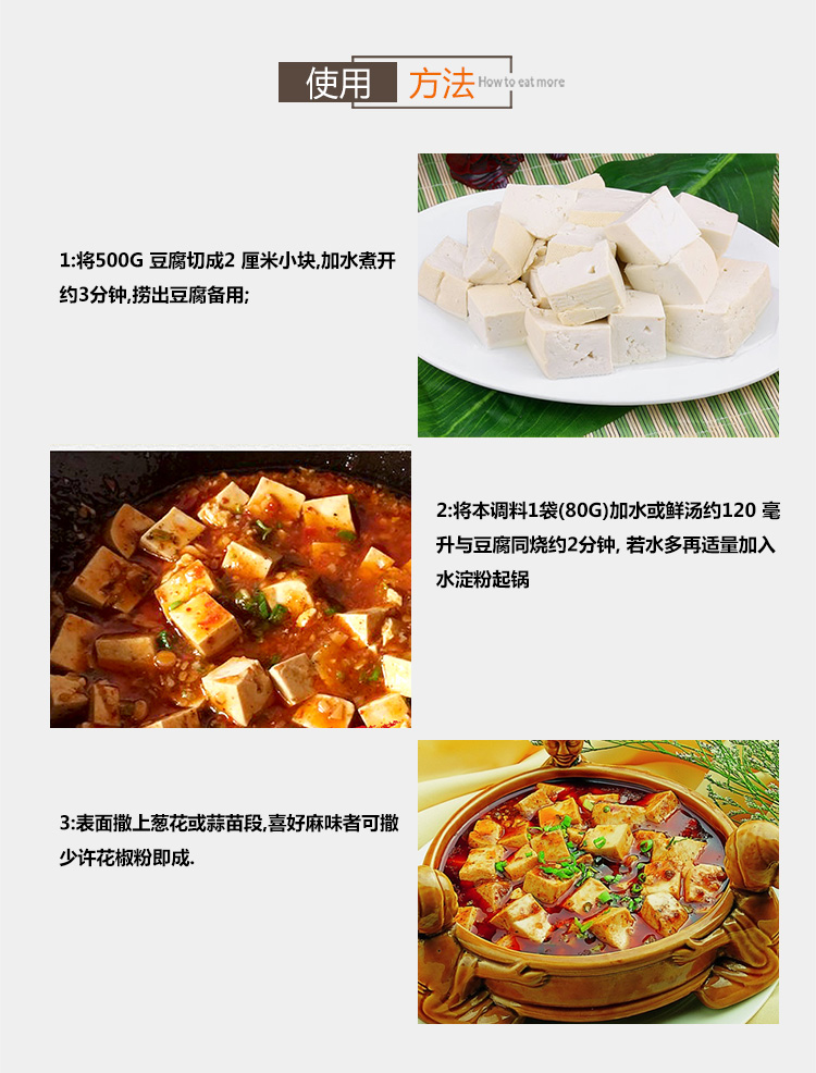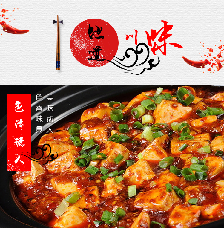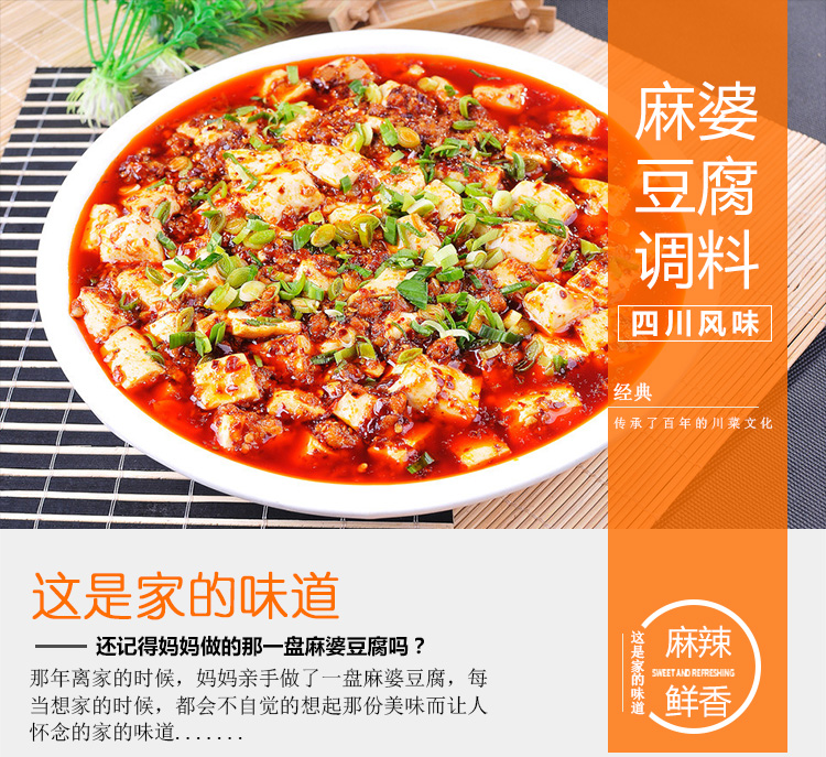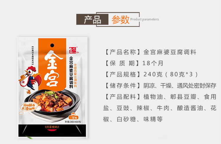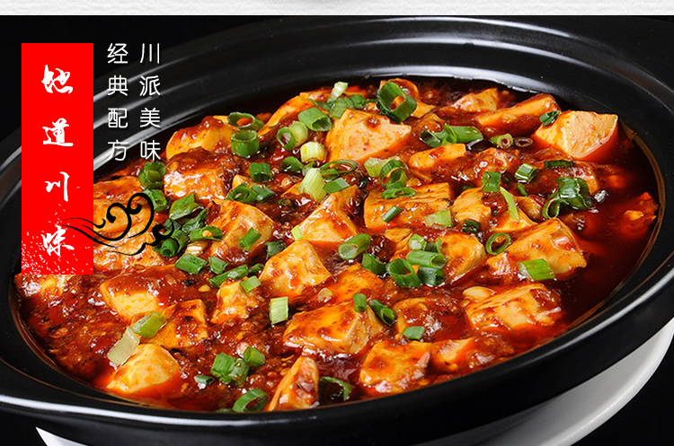 产品简介:四川名菜—麻婆豆腐,创始于清朝同治元年,其麻、辣、嫩、烫、酥、香的特点,深受人们喜爱。金宫麻婆豆腐调料传承经典,创新研制,在保留菜品固有特点的同时,豆腐与调料巧妙结合,满足挑剔的味蕾,和家人朋友一起分享美味。